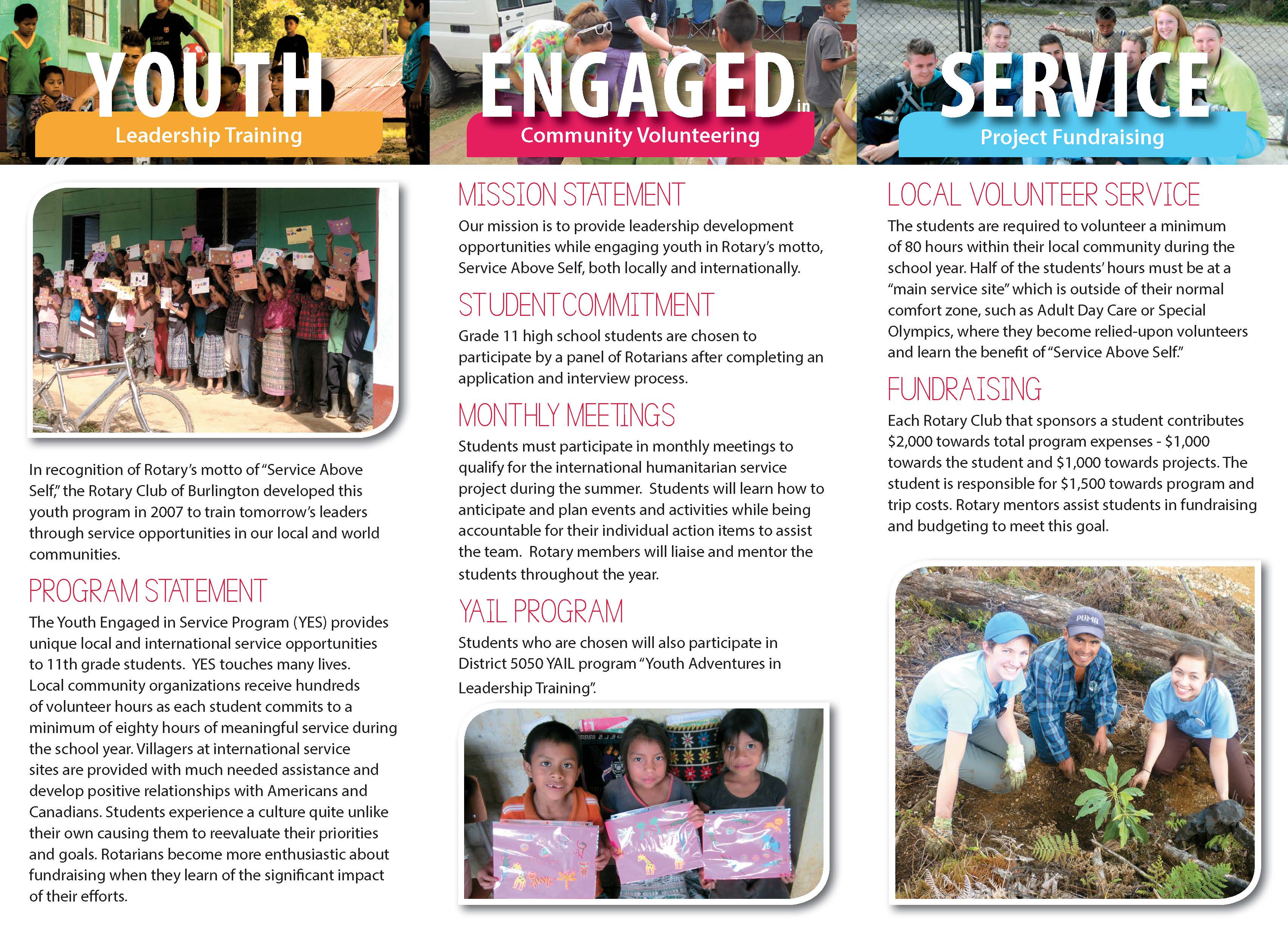 High school students throughout Rotary District 5050 are being offered the opportunity to experience the joy of serving others by volunteering in their local community and participating in an international humanitarian service project. Students attend monthly leadership training meetings and contribute 80 hours of local volunteer service during their Junior Year–Grade 11.